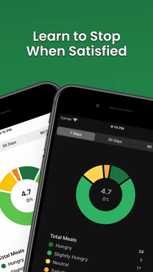 The Analysis Page helps you see your food patterns over the last seven days. You will easily find the number of meals logged, the percentage of them eaten when hungry, and at what point overeating may have occurred.