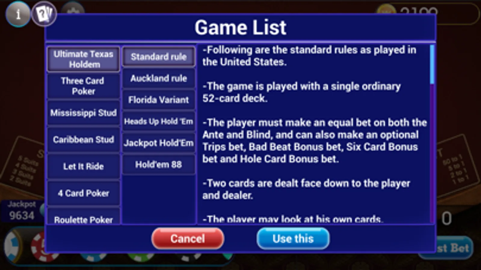 + Ultimate Poker Texas Holdem: standard rule, Auckland and Florida rules.