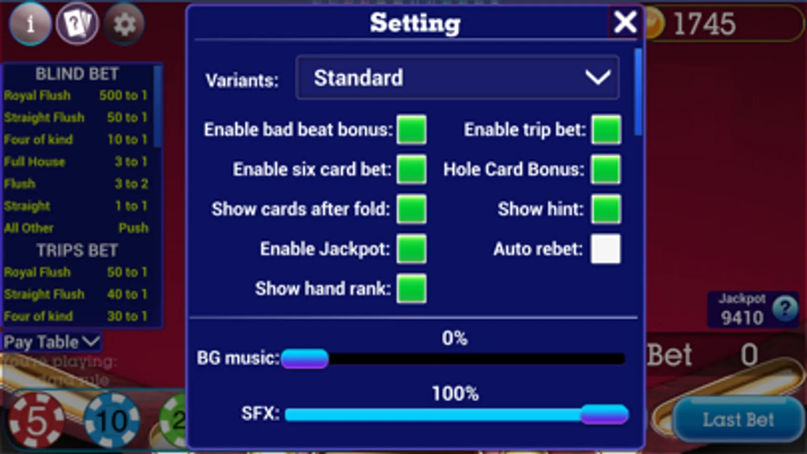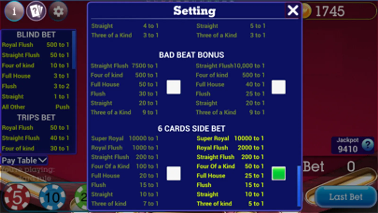 + Three Cards Poker: standard rule, face up variant and Ultimate 3 card.