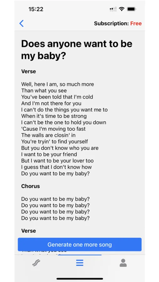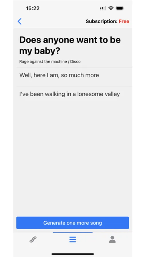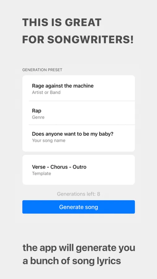 The application makes it possible to generate any song text by specifying the name of the song, author, genre and keywords, as well as the model by which the text is built.