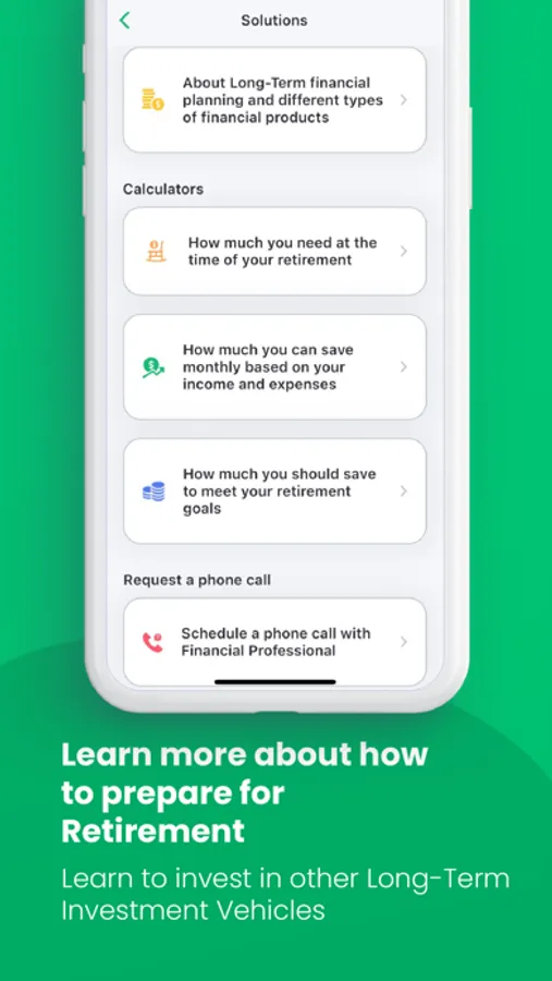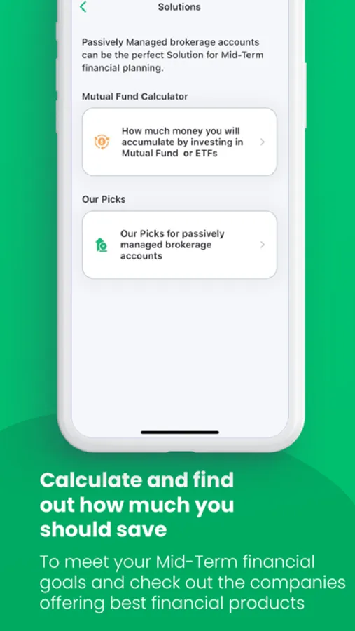 After you calculate how much you need and how much you can save based on your today’s income and expenses this app will help you find right financial products to meet your short, mid and long term financial goals.