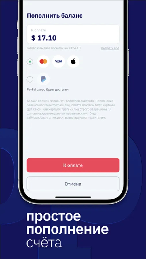 Для оплаты доставки из США, нужно пополнить баланс на необходимую сумму в приложении, для этого перейти в раздел с посылками, выбрать посылку и нажать кнопку оплатить. Для пополнения баланса авторизуйтесь в приложении и перейдите в профиль пользователя.