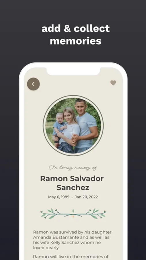 Create a public page for your loved one and share with friends and family to begin collecting stories, photos, and favorite things about your loved one.