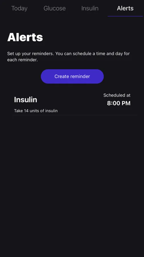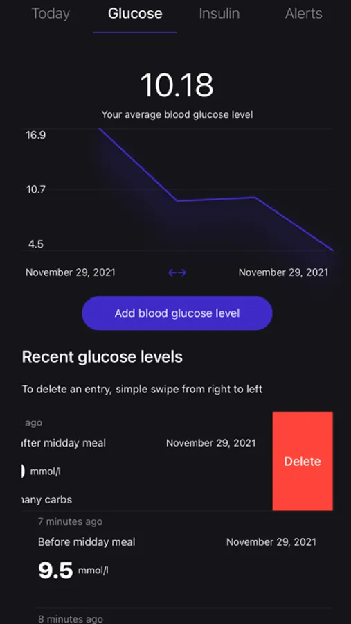 We've split Glucose into 3 main sections - today's view which documents and details your activities for the current date, glucose/blood sugar levels and insulin. Making it easier than ever before to keep on top of your diabetes.