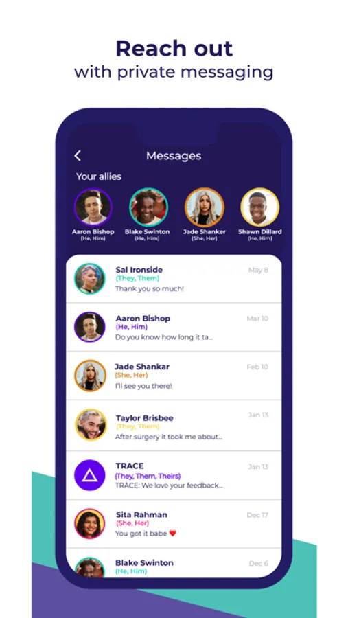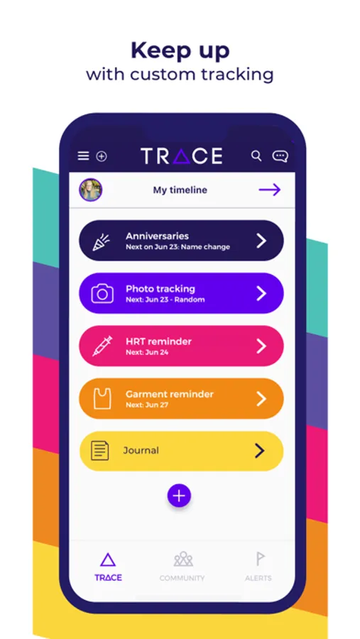 TRACE is a mobile application created to foster a brighter and more gender-affirming future for transgender and non-binary individuals. TRACE seeks to provide those in transition, a place to document and celebrate their journey among a trusted community of allies.