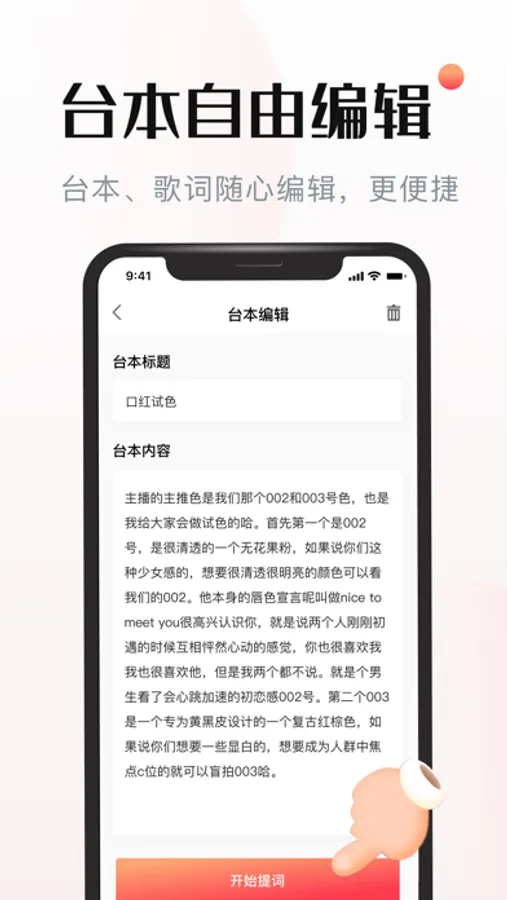 【新建台本】自定义台本标题,更易查找;输入台本内容后支持悬浮窗录制,写完台词不用记,点击开始提词即可进入录制模式;视频录制就是如此简单。