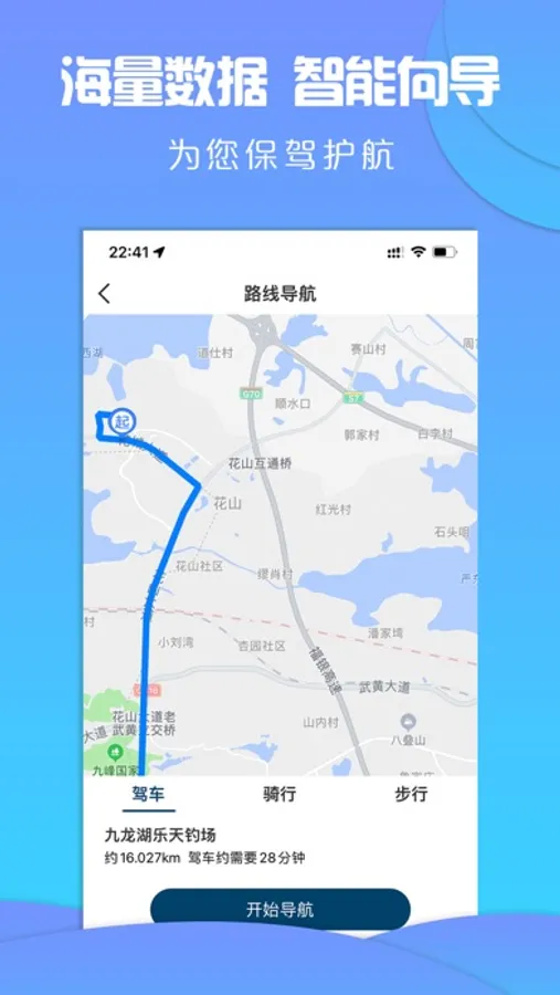 3、查看钓点路线:APP通过地图,绘制了前往钓点的地图路线,包括钓点距离,以及到达钓点需要花费的时间。