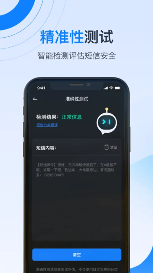 短信安全宝使用基于统计学的机器学习算法从几十万条各类短信样本中学习而成。无需用户配置任何关键词,它通过识别一个短信的语义特征,自己就可以精准的判断收到的短信是正常短信、公益短信还是广告骚扰短信等等。