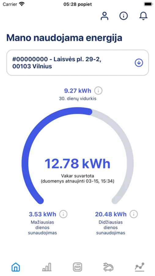 - Įvertinti praėjusios dienos energijos suvartojimo kiekį lyginant su mažiausiu ir didžiausiu sunaudotu kiekiu per paskutines 30 dienų;