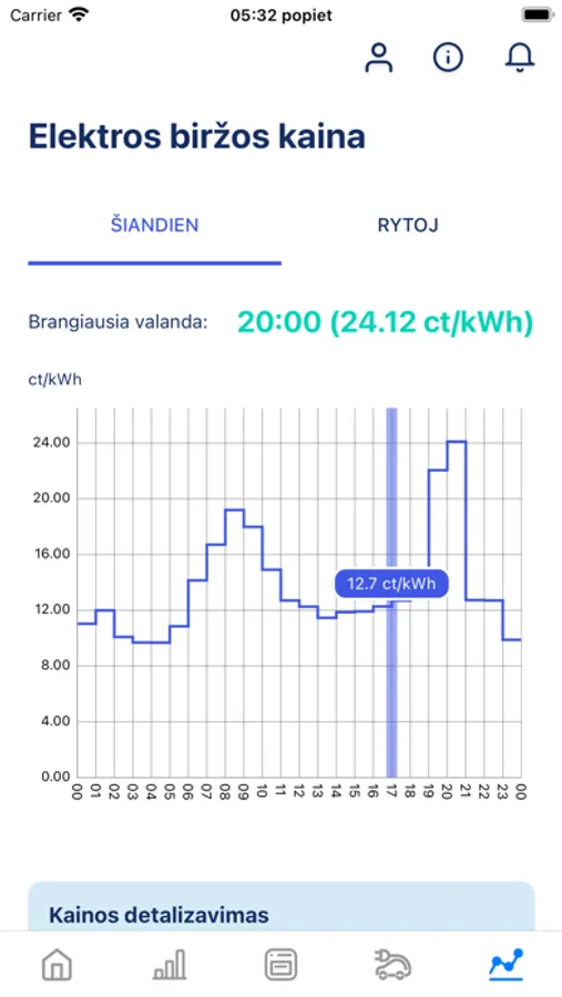 - Stebėti einamosios ir kitos dienos elektros biržos kainos pokyčius ir atitinkamai planuoti elektros suvartojimą pigiausiomis valandomis.