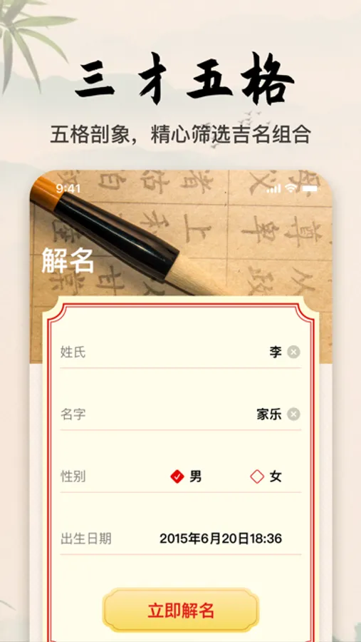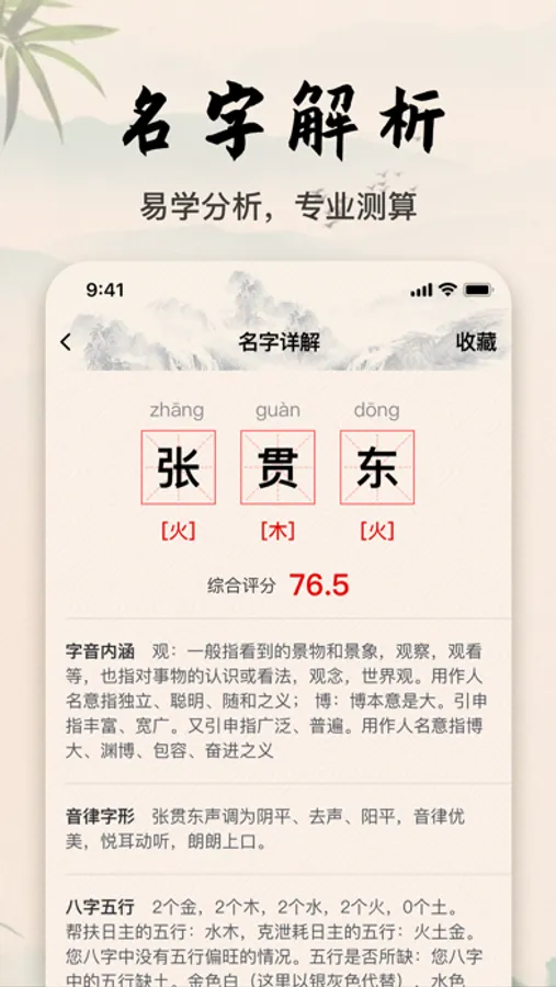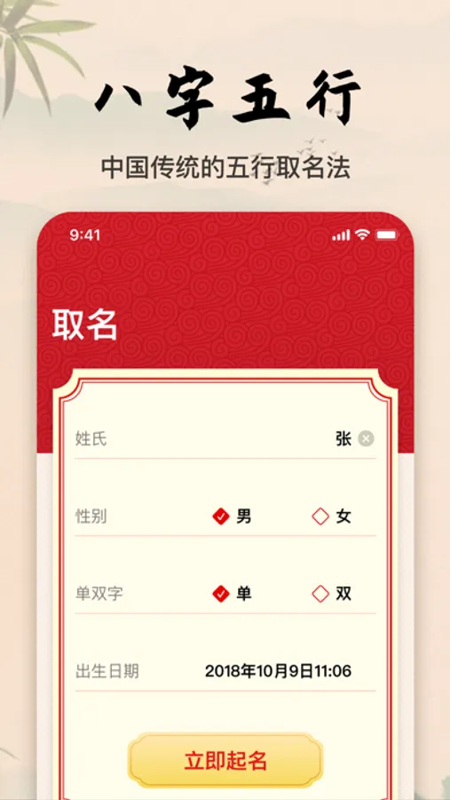 The traditional Chinese eight-character five-element naming method is based on the date of birth to calculate the traditional Ganzhi timing to determine the five elements' blessings and taboos, and combine the Zhouyi Zhonghe balance principle to recommend the combination of auspicious names.