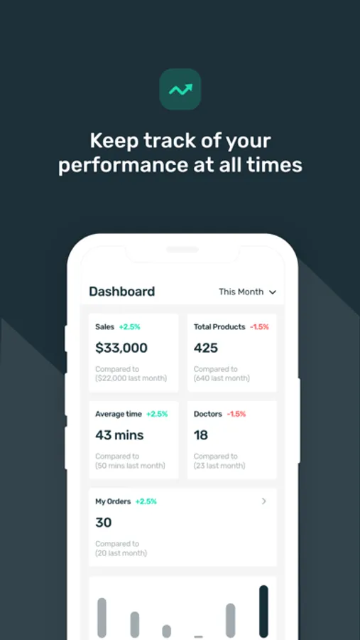 Finally, It helps you in checking your current and past order details, as well as tracking your monthly progress on the app’s dashboard, by viewing the number of dentists served and the number of earnings got by each sales member.