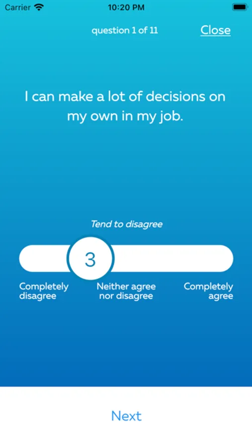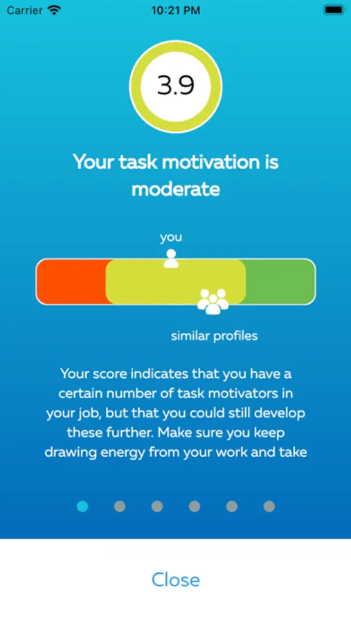 Each module consists of a short questionnaire – a list of statements, presented with a simple rating scale: users can endorse each statement (1= completely disagree to 7=completely agree). After completion of a module, users will receive immediate feedback: a graphic result for the given topic with peer benchmarking, and a brief personalised advice to improve their individual well-being balance.