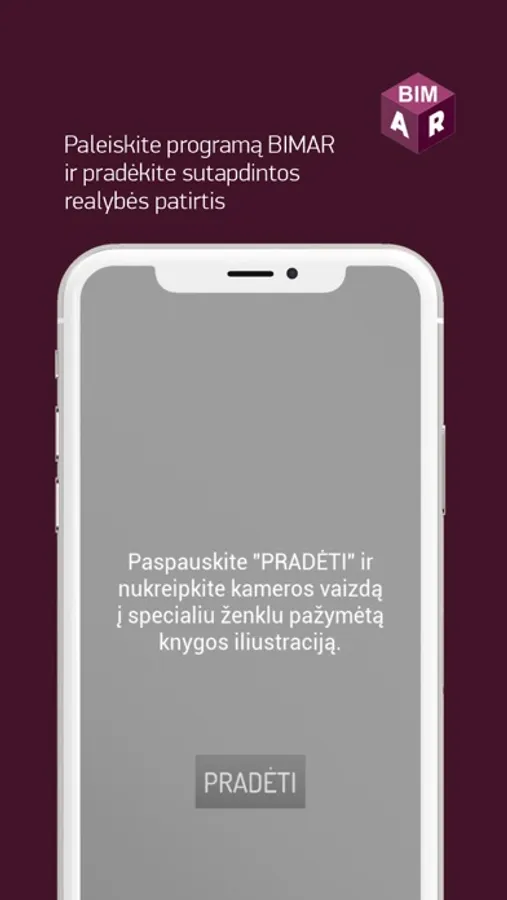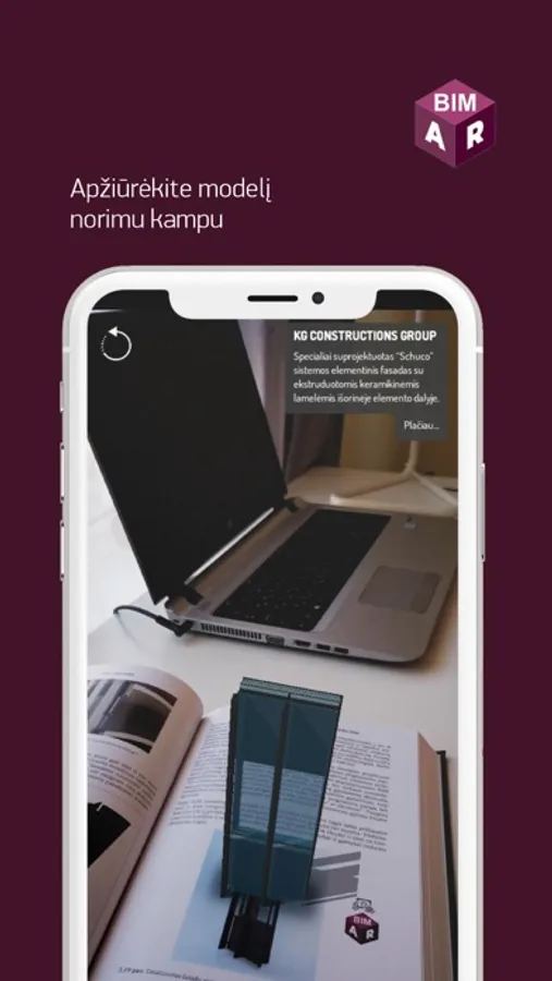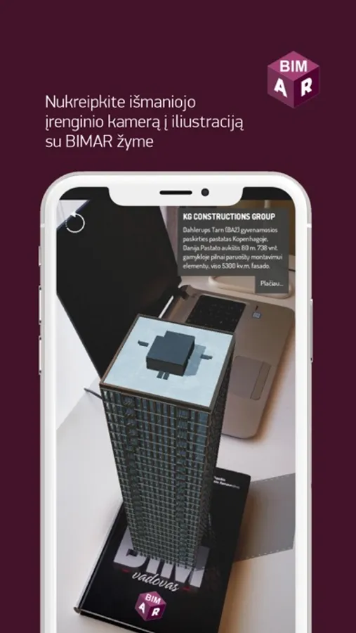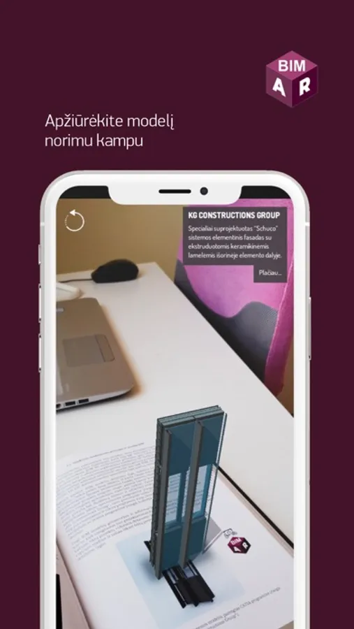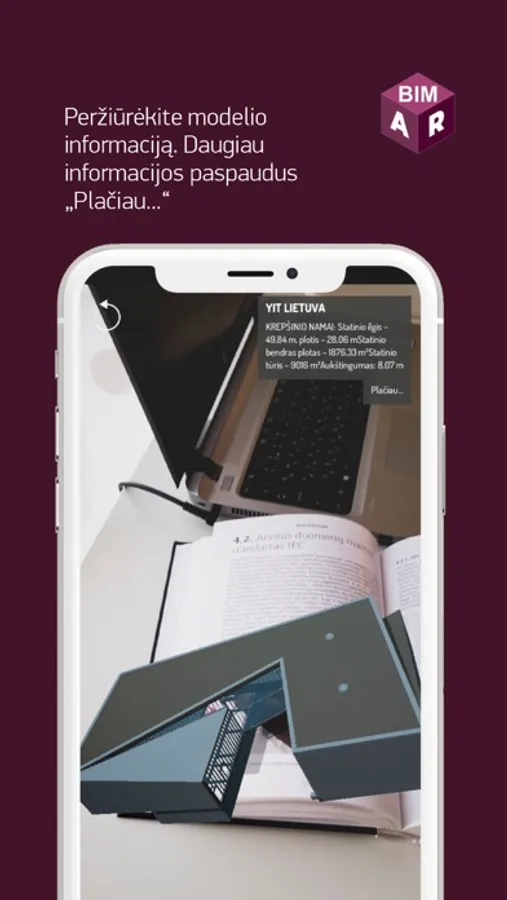 Įdiegus programėlę ir išmaniojo įrenginio kamerą nukreipus į BIMAR žyme paženklintą iliustraciją knygoje "BIM vadovas", ekrane matomas susietas 3D modelis, kurio informaciją galima peržiūrėti.