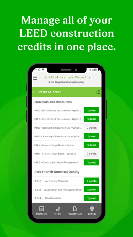 Over a third of the points needed for certification – documented right from your phone or tablet! Manage your LEED v3 construction credits, and export reports and updates in real time.