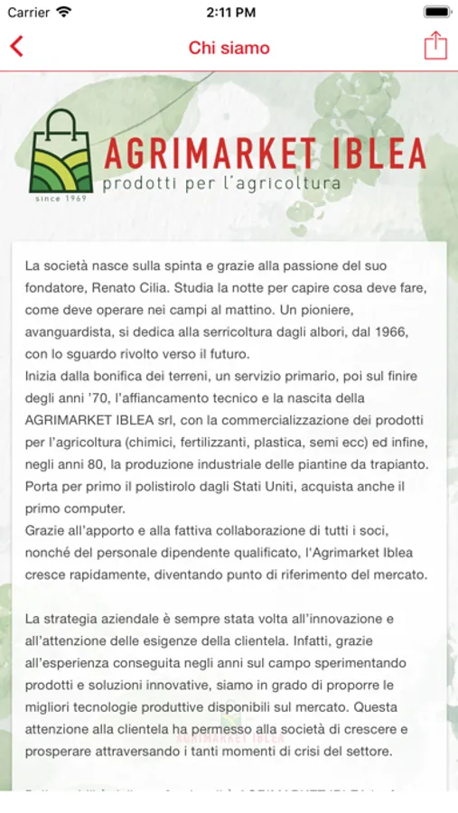 AGRIMARKET IBLEA srl è diretta alla commercializzazione e vendita all’ingrosso di prodotti per l’agricoltura. L’attività viene svolta attraverso una rete di magazzini propri dislocati nella Sicilia Sud-Orientale. La clientela è rappresentata principalmente da produttori agricoli. I fornitori della società sono tipicamente aziende multinazionali del settore chimico, Società sementiere per le forniture di semi per piante, e industrie di produzione dei film in polietilene. L’attività si compone di due elementi importanti: la consulenza e la promozione. Infatti l’agricoltore professionale necessità di un supporto tecnico nella scelta dei prodotti più efficaci, tale scelta deve tenere conto sia delle caratteristiche della produzione e sia del problema e/o esigenza del cliente. Proprio in quest’ultimo ambito la competenza e l’esperienza del personale dell’azienda gioca un ruolo fondamentale, permettendo di conseguire una elevata fidelizzazione della clientela. La fase della promozione è quindi consequenziale e quasi subordinata alla prima fase. Questo ci ha permesso di assumere il ruolo di partner sia delle industrie di prodotti per l’agricoltura, con le quali l’AGRIMARKET IBLEA srl collabora suggerendo miglioramenti e fornendo feedback sull’efficacia sul campo dei loro prodotti, sia degli imprenditori agricoli consigliando le più innovative ed efficaci soluzioni risolutive delle principali criticità produttive.
