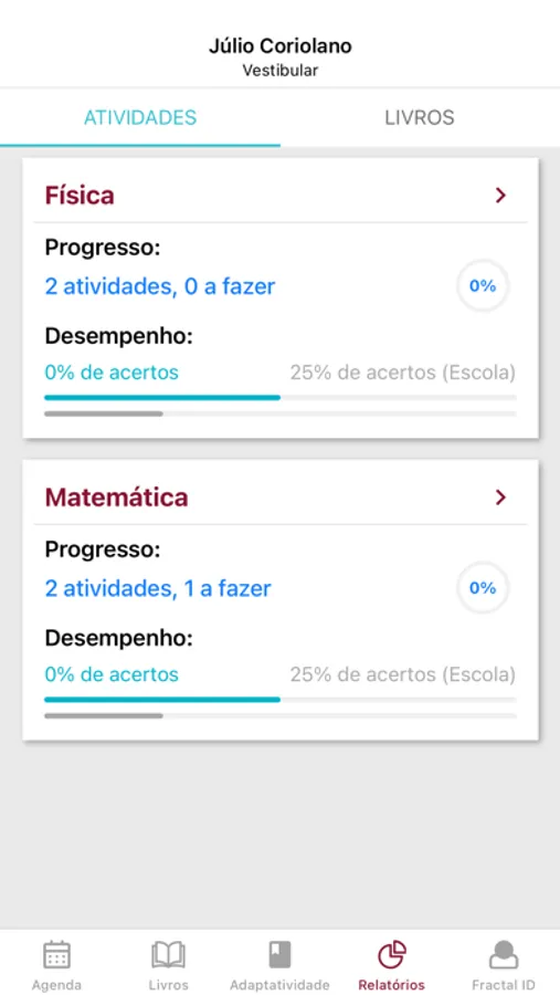 Através dos relatórios gerados pelo APP, o aluno poderá saber desempenho em relação a tópicos específicos de cada matéria, além de acompanhar o seu desempenho pelos históricos de tarefas, módulos e provas.
