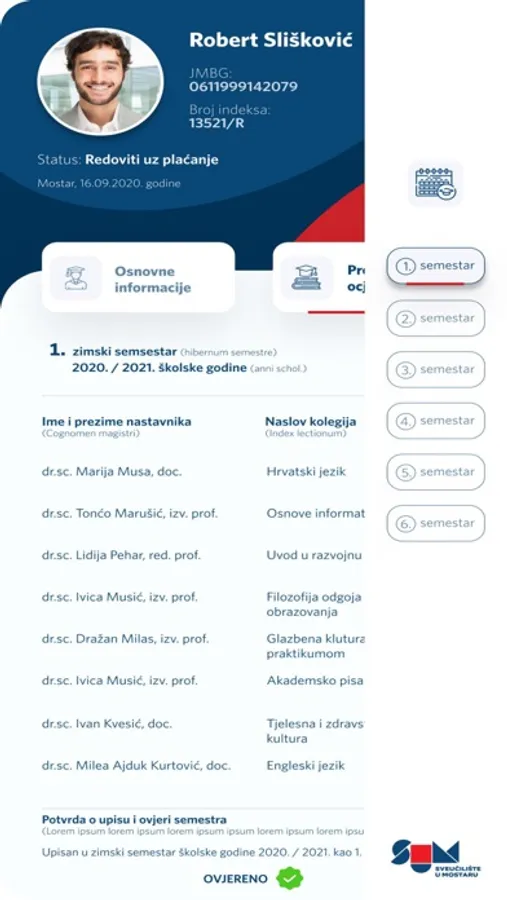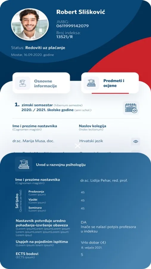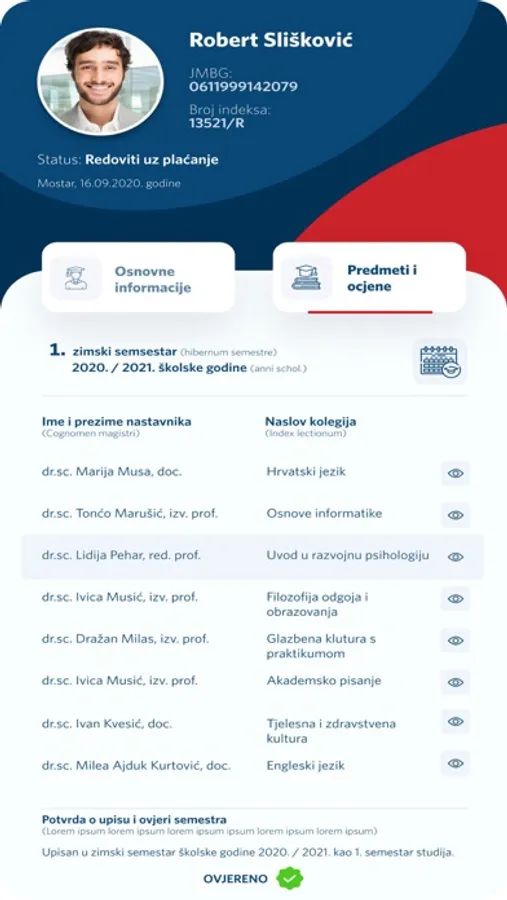 Omogućuje pregled osnovnih informacija o upisanom studiju, te pregled svih predmeta po semestrima, informacija o tim predmetima i upisanim ocjenama.