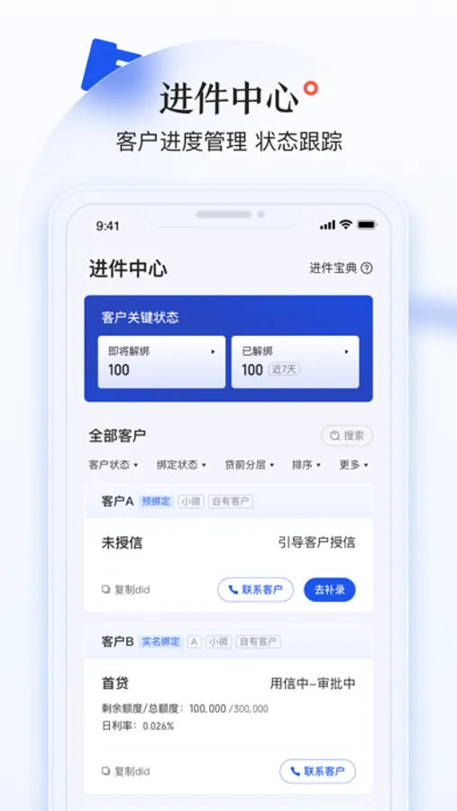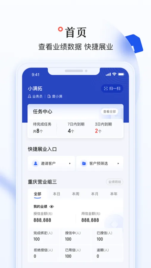 小满拓APP为度小满金融产品的线下展业流程管理、客户管理、客户申请进度跟踪、业绩管理及业务实操效率提升工具。聚焦线下展业的服务效率提升和金融业务的客户获取,为线下业务拓展提供客户信息查询和提效工具。