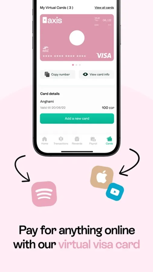 Introducing Axis, the ultimate payments solution for Egyptians. Licensed by the Central Bank of Egypt, Axis is not just a digital wallet with a virtual Visa card, it's the only wallet in Egypt where you can receive your salary instantly. Revolutionizing the way you manage your finances, Axis offers a complete and diversified range of services for a seamless digital experience.