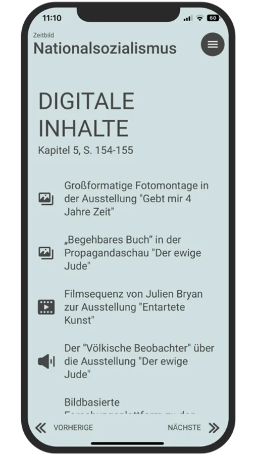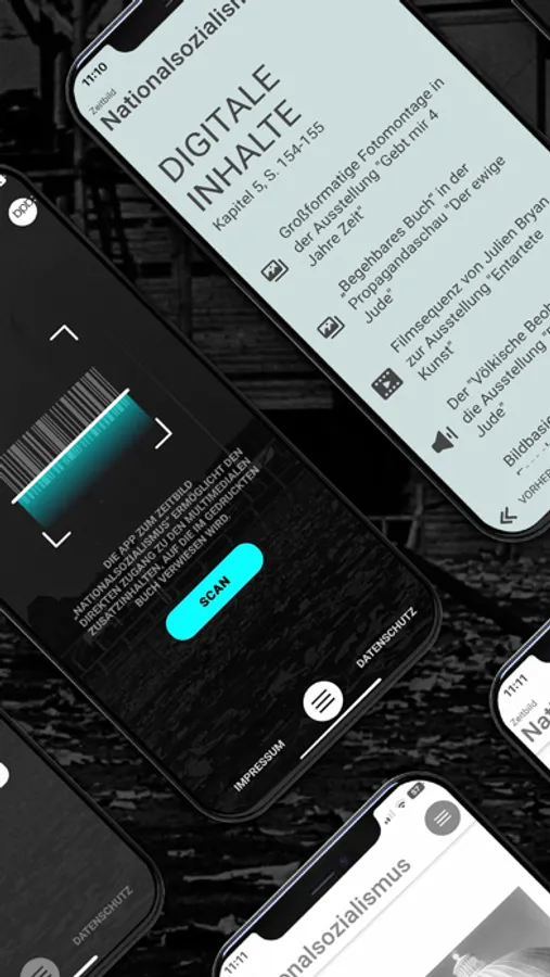 Per Scan gelangen Sie zu insgesamt 125 weiteren Abbildungen, 75 Film- und Videosequenzen, 109 Audio-Dateien, 130 Sekundärtexten und Textdokumenten sowie 90 Links auf Websites und Webportale. Diese sind den Inhalten einer Doppelseite zugeordnet und ergänzen das Zeitbild „Nationalsozialismus“ der Bundeszentrale für politische Bildung zum Hybrid-Buch.