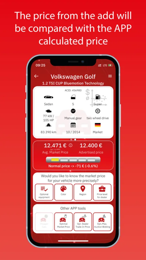 Afterwards, our APP system tries to read and interpret all this information of your single car and compares that to all similar cars our APP system found online.