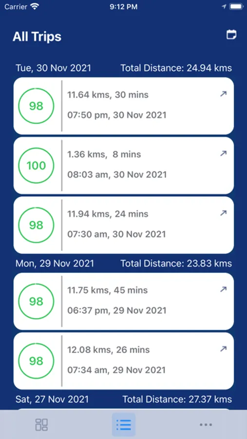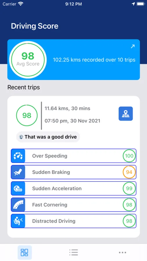 AutoBeacon's Home screen shows your consolidated Safe Driving Score (out of 100). It also shows summary of your recent trips. Tapping on the Location Icon shows for any trip shows the exact route of the trip, the location and severity of various Driving alerts. AutoBeacon's "All Trips" screen shows the log of your historical trips organized by each day. Tapping on any particular trip shows the Trip summary for that trip. Driving Score trend screen shows you the weekly trend of your Safe Driving score and its constituent scores.