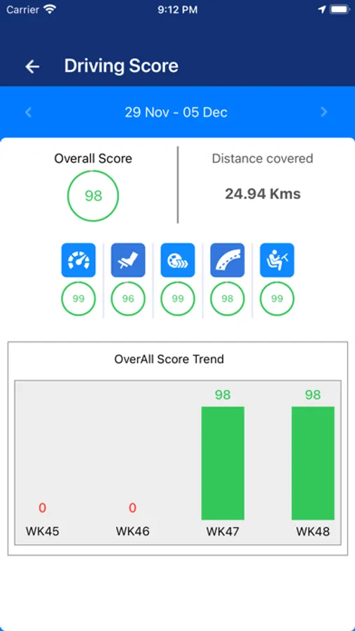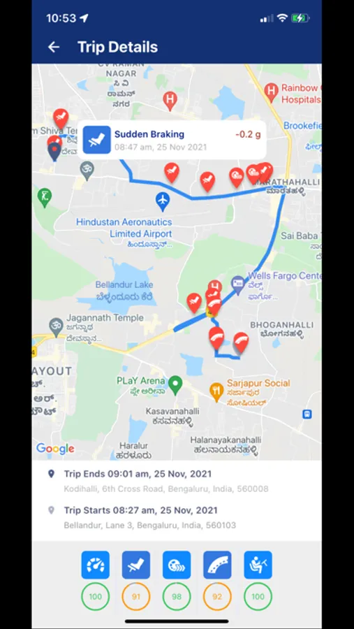 AutoBeacon App measures each trip on rash or unsafe driving parameters including Overspeeding, Sudden Braking, Sudden Acceleration, Fast Cornering and Distracted Driving. These parameters are individually rated as well as a consolidated Safe Driving Score is generated. Apart from Driving behavior, AutoBeacon App measures the driving distance and driving time for each trip.