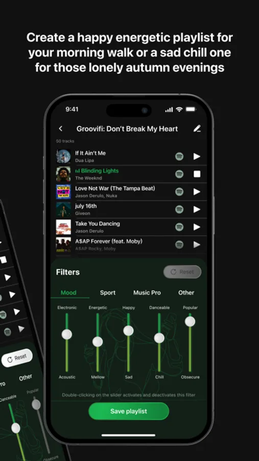 Do you want to create a playlist for your evening jog? We have got just the thing for you. Are you sad and need some good music to chase away your bad mood? Look no further! Let Groovifi work with the Spotify algorithm to create tailor-made playlists for you!