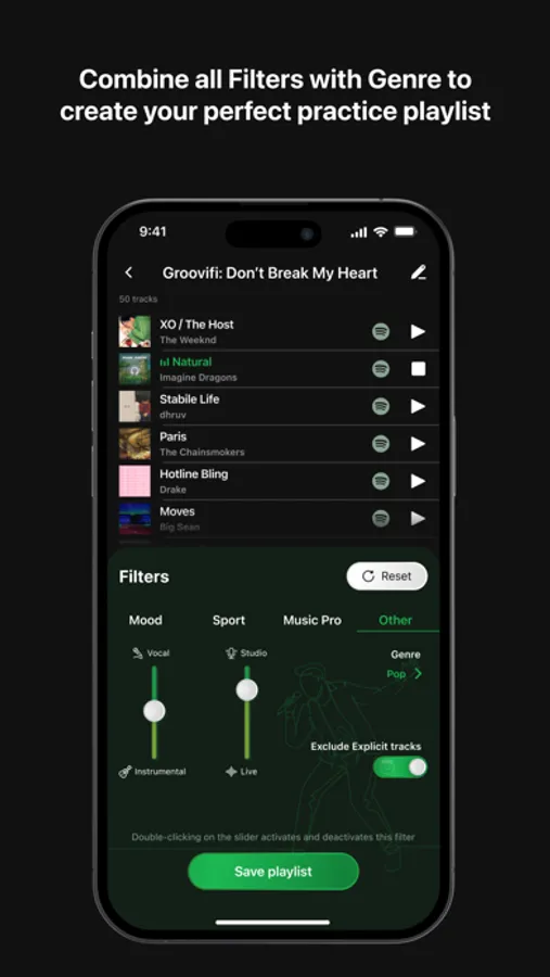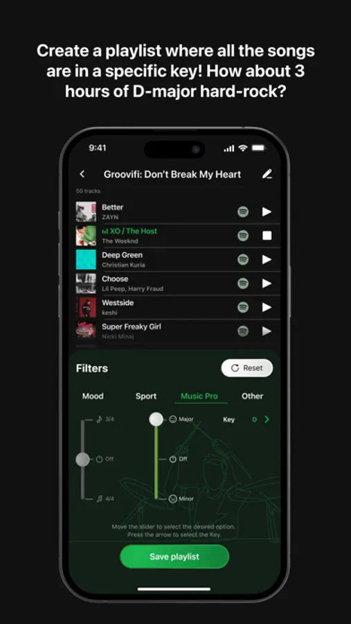 Your Music, Your Style, Your Sound - Take your Spotify playlists to the next level. Create a playlist of your own personalized sounds, tuned right to your favorite mood, genre, BPM. Search like a pro by setting your musical key, mode (major/minor), and even meter. Tune the playlist to your heart's content, and when you are ready - simply save it to your Spotify account.