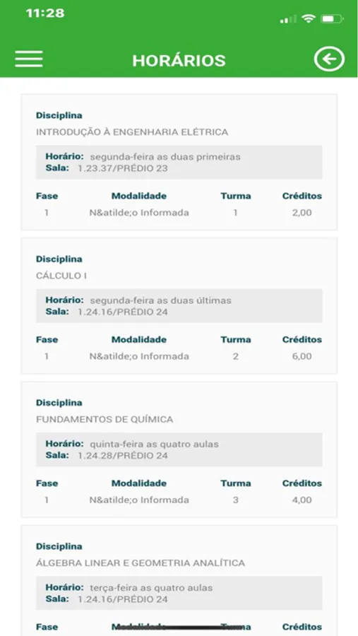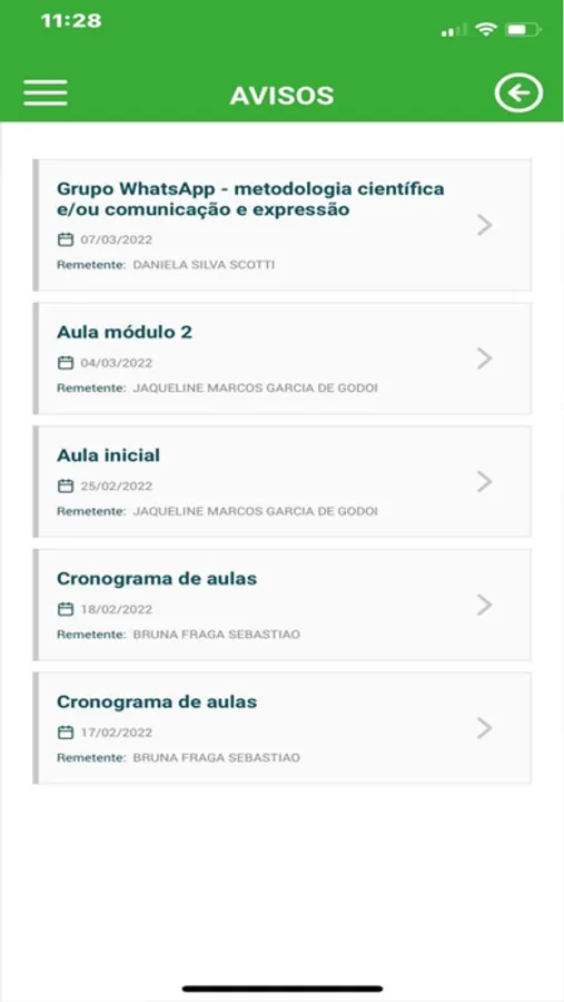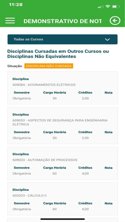 - Notas (Avaliações): Essa lista mostra todas as notas do aluno já publicadas pelos professores no semestre, inclusive das turmas pelas quais ele passou e não faz mais parte.