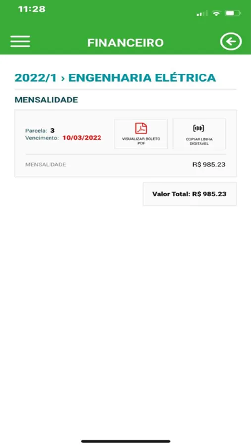 - Boletos: Lista os boletos do aluno disponíveis para pagamento seguindo a mesma regra do portal do aluno.