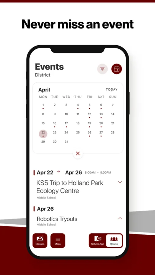 The event section shows a list of events throughout the district. Users can add an event to their calendar to share the event with friends and family with one tap.
