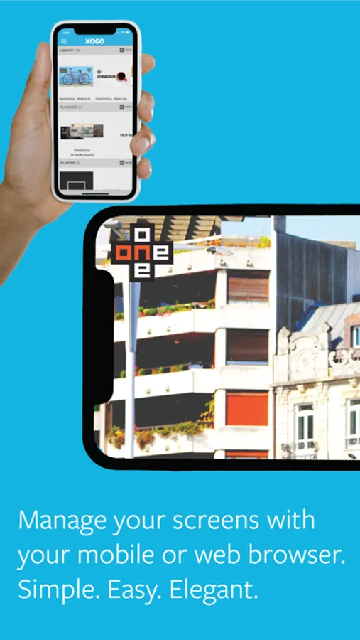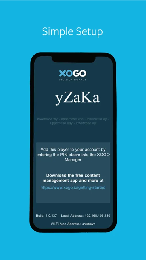 XOGO Player continuously loops the content (graphics, videos and URLs) that you send to it via our free XOGO Manager app. Connecting the two is simple; just enter a 5-digit PIN code. Please check out www.xogo.io/getting-started for illustrated instructions.