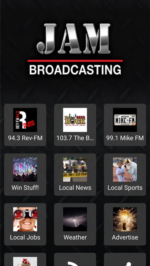 Listen to 94.3 Rev-FM (KRVL-FM), 99.1 Mike FM (KZAH-FM), and 103.7 The Buck (KAXA-FM) anytime, anywhere! The JAM Broadcasting phone app has players for each JAM Broadcasting station. Keep up to date with local news, JAM Broadcasting promotions, call the radio stations directly from the phone app, text into the radio stations directly from the phone app. Looking for local sports? The JAM Broadcasting app also has Kerr County, Gillespie County, Bandera County, and Kendall County sports information on the app.