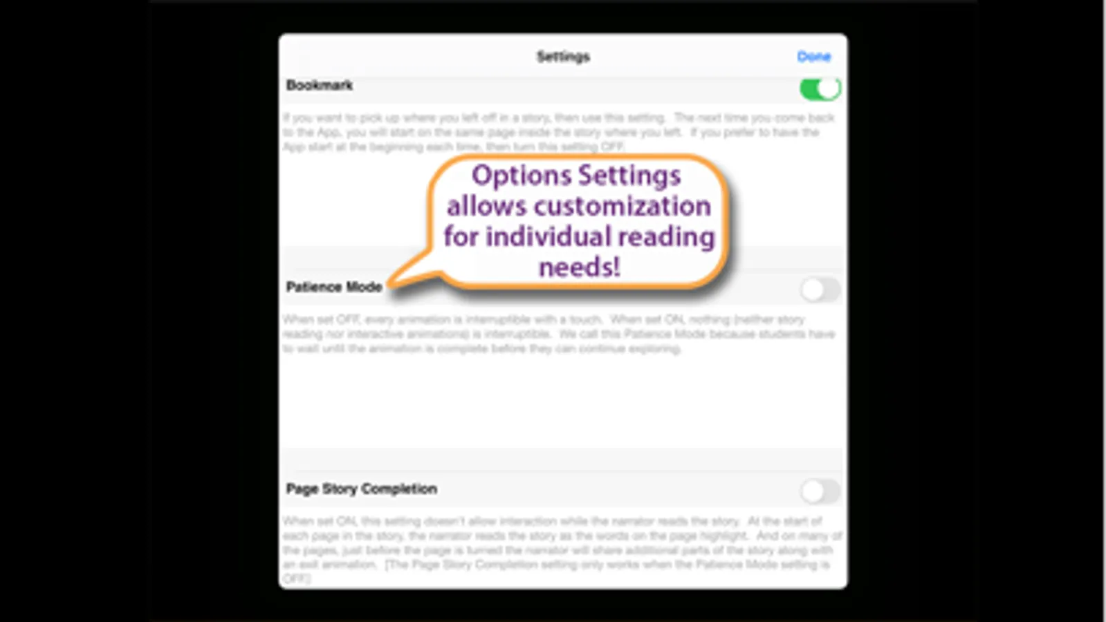 • Multiple settings to further customize the App for your child’s reading experience
