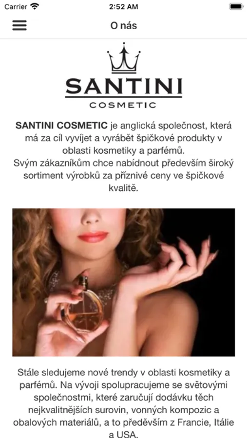 Aplikace Santini Cosmetic obsahuje důležité informace o firmě a jejich produktech. Hledáte kvalitní francouzské parfémy? Vyzkoušejte ty od firmy Santini, která přináší na trh luxusní vůně za vynikající ceny.