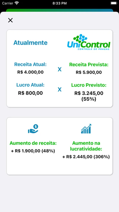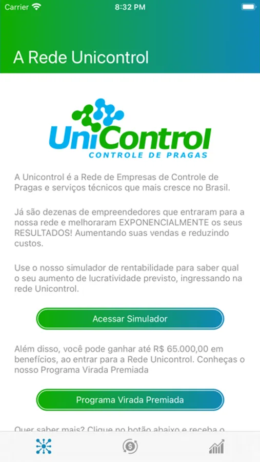 O Simulador de Rentabilidade Unicontrol foi desenvolvido para você, que já possui uma empresa de controle de pragas, e quer alavancar os seus resultados. Nele você encontrará informações sobre o investimento necessário e o retorno previsto ao entrar para a Rede de PCO's que mais cresce no país!