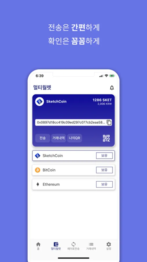 간편한 사용법• 언제, 어디서나 메인넷 코인 및 각종 토큰을 전 세계 누구에게나 즉시 전송• QR 코드 스캔 기능으로 디지털 자산을 보내고, 받고, 결제까지• 주소록 – 자주 거래하지만 관리하기 어려운 암호화폐 지갑 주소에 이름을 지정하여 주소록에 저장 및 편리하게 사용