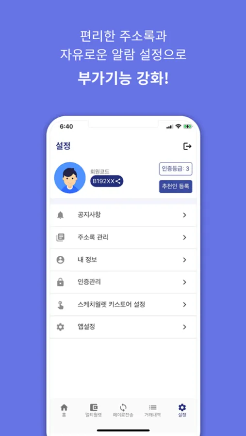 철통 보안 지갑• 6자리 핀으로 키스토어 관리 및 인증• 고급 2팩터 인증으로 해킹 예방• 고유한 12단어 조합을 통한 백업 및 복구 간소화