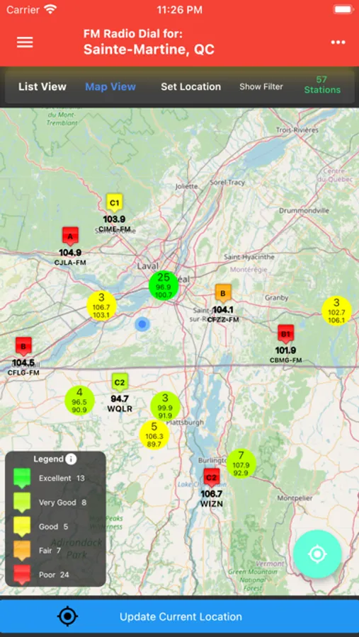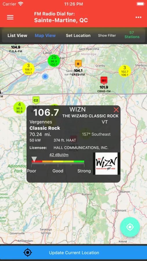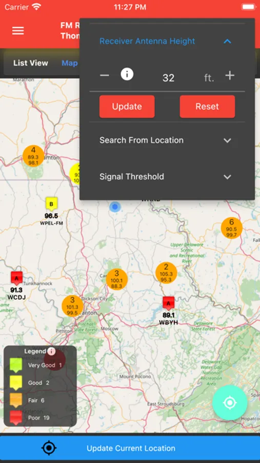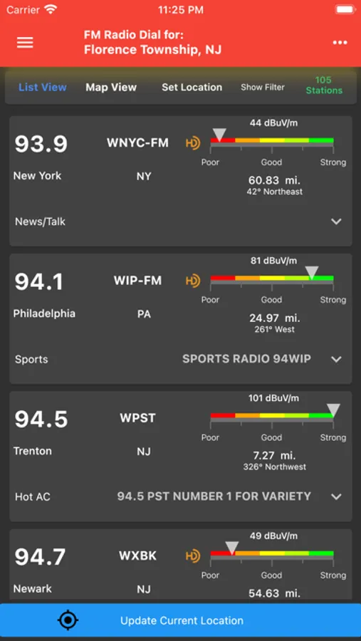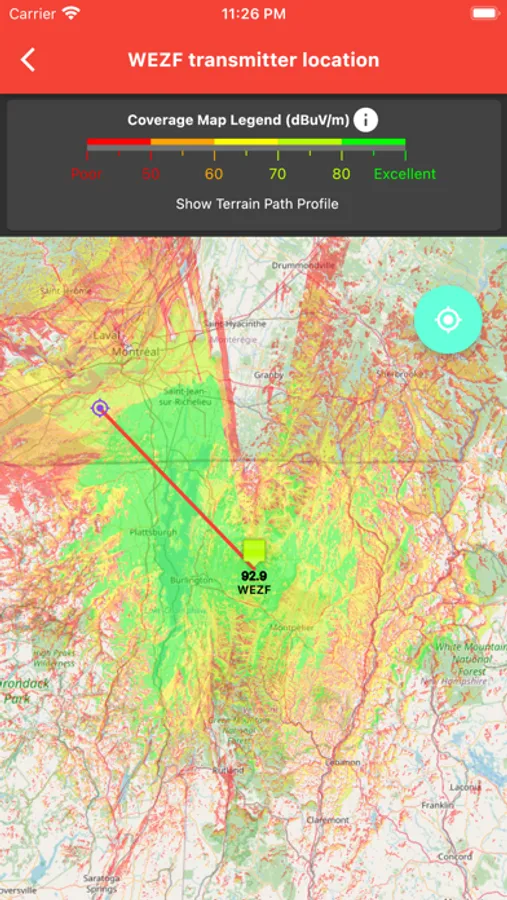 Finally, an app that tells you what radio stations you ought to be able to hear on your FM dial if you turn your radio on! RadioLand uses a propagation algorithm to determine which stations you should be in range with, factoring in terrain and other obstacles, from either your device's current location, or search for any location in North America, Bermuda, or the Caribbean. Use our location search or select your location on a map. View listings in list view or map view. Coverage maps are available for U.S. stations. Interference analysis for stations with co-channel or adjacent channel interference. HD sub-channel format and slogan listings. NFL and MLB affiliate listings. Terrain profile view to view inhibiting terrain obstacles in between your location and the antenna of the signal in question. Wide variety of search options including search by frequency from location. Adjustable receiver height above ground level.