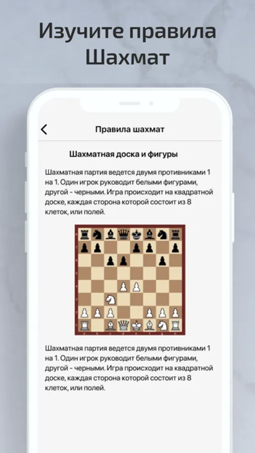 Не знаешь правила игры как ходит пешка? Кто такой Ферзь в шахматах? Как обычная Пешка может стать Ферзем? Когда вопрос есть, а ответа нет, тогда устанавливай скорей наше приложение, оно поможет тебе разобраться не только с правилами игры в шахматы, но и как ходят фигуры. Притом все правила игры абсолютно бесплатно! У нас ты узнаешь, чем отличается ферзь от ладьи, как ходит Конь, сможет ли обычная пешка победить Ферзя. Множество комбинация и все правила игры в эту чудную игру в которую играли отцы, деды и прадеды. Ведь этой великой игре более более полутора тысяч лет. Так что устанавливай скорей и прокачивай навык игры в Шахматы.