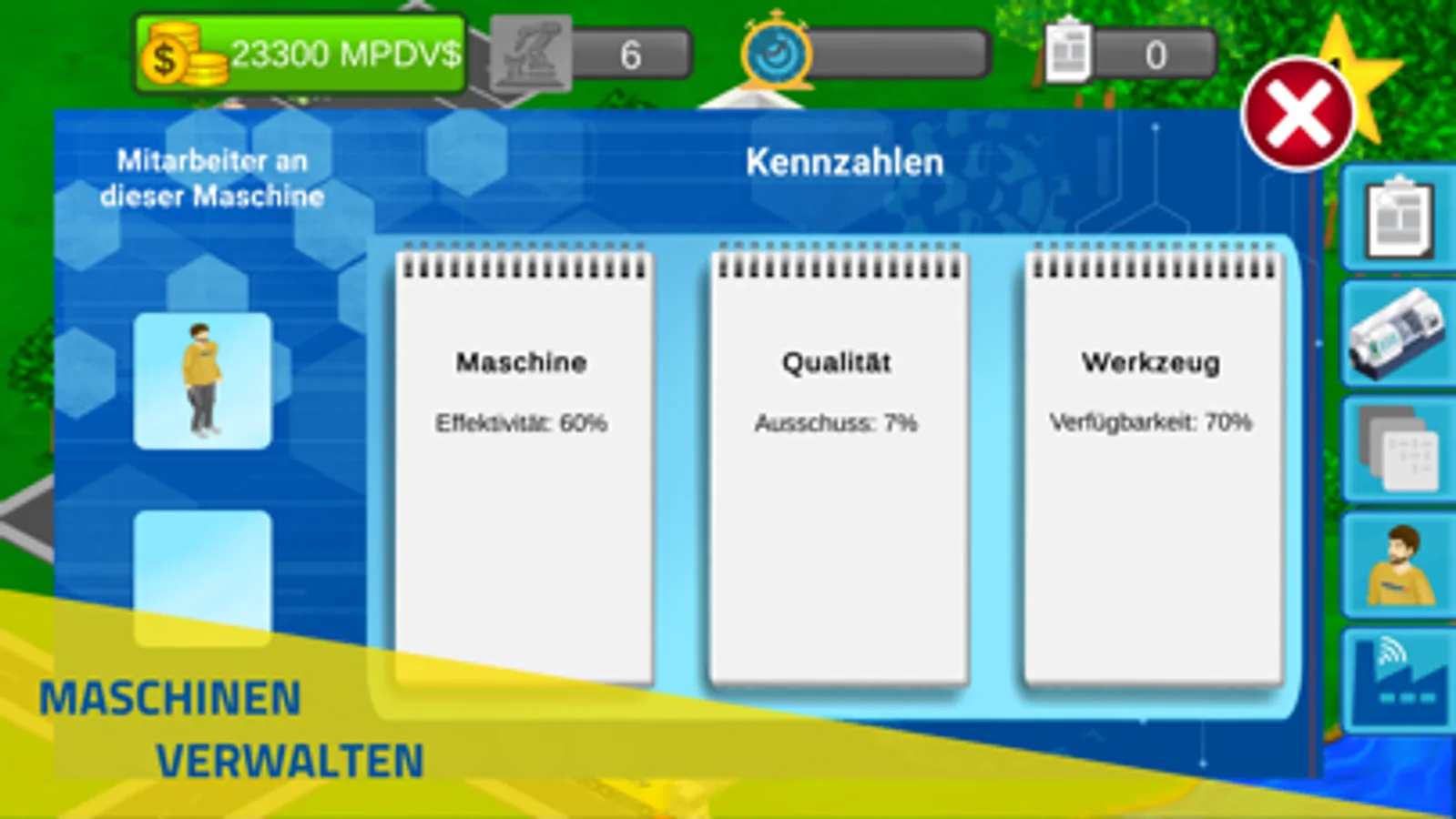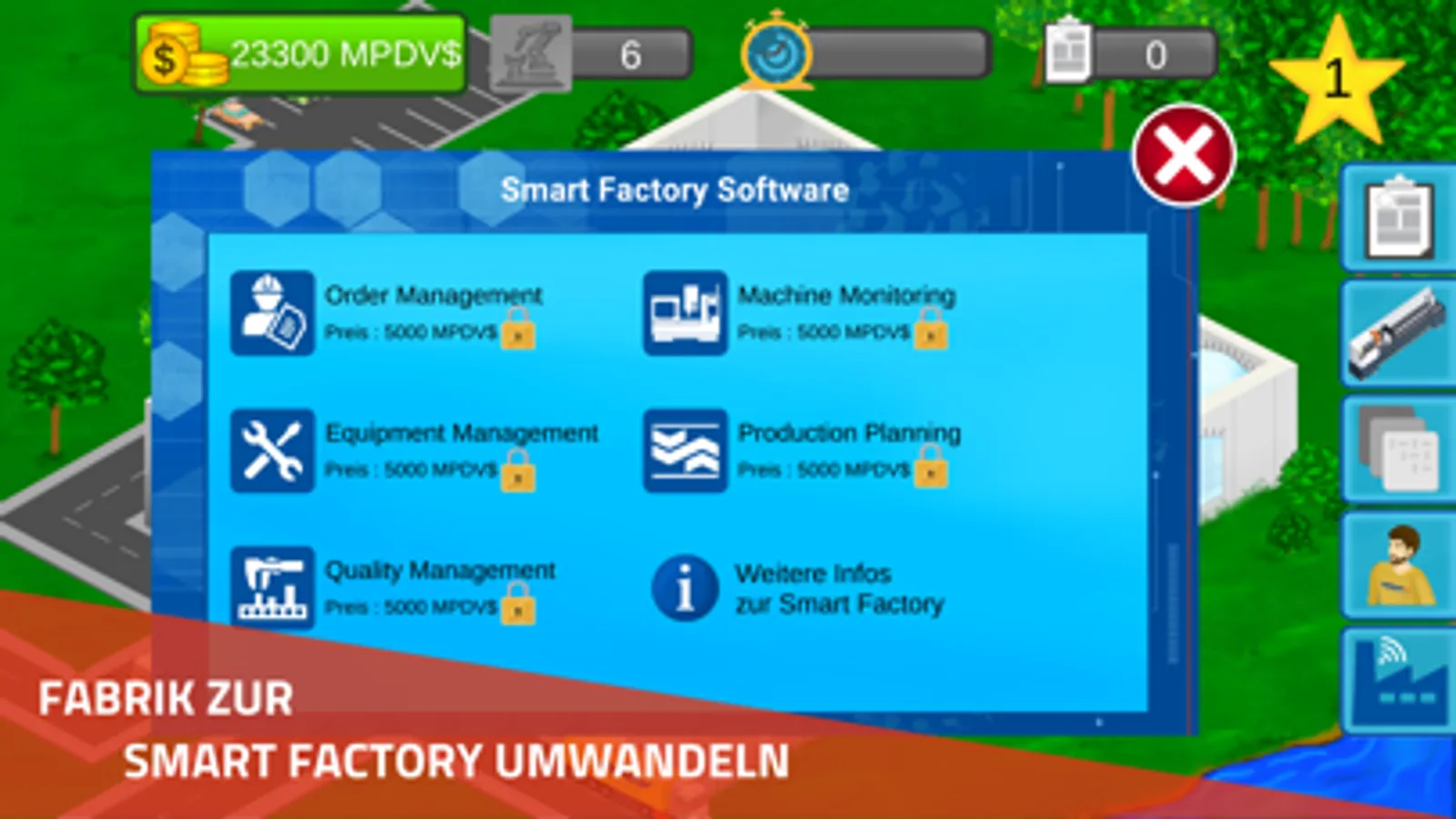 Werden Sie Eigentümer eines Fertigungsunternehmens und bauen Sie Ihre eigene Produktion auf. Führen Sie Ihr Unternehmen durch das Einstellen von Mitarbeitern, den Kauf von Maschinen und Rohstoffe, sowie passende Software zum Erfolg! Gleichzeitig lernen Sie die Vorteile einer Smart Factory kennen.