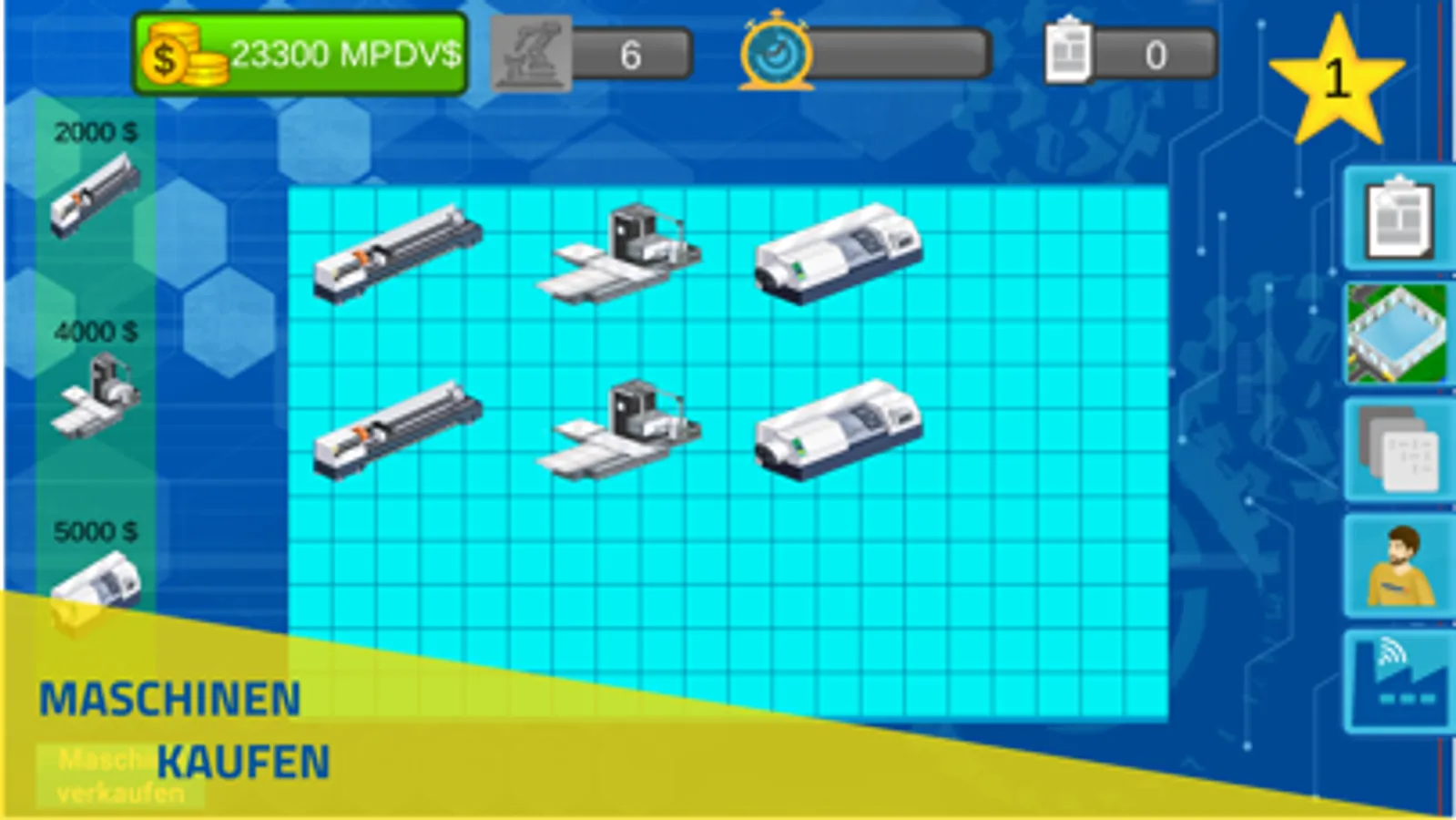 • Das Spiel beginnt mit einer leeren Fabrikhalle, die sich im Laufe des Spiels mit Maschinen und Mitarbeitern füllt.