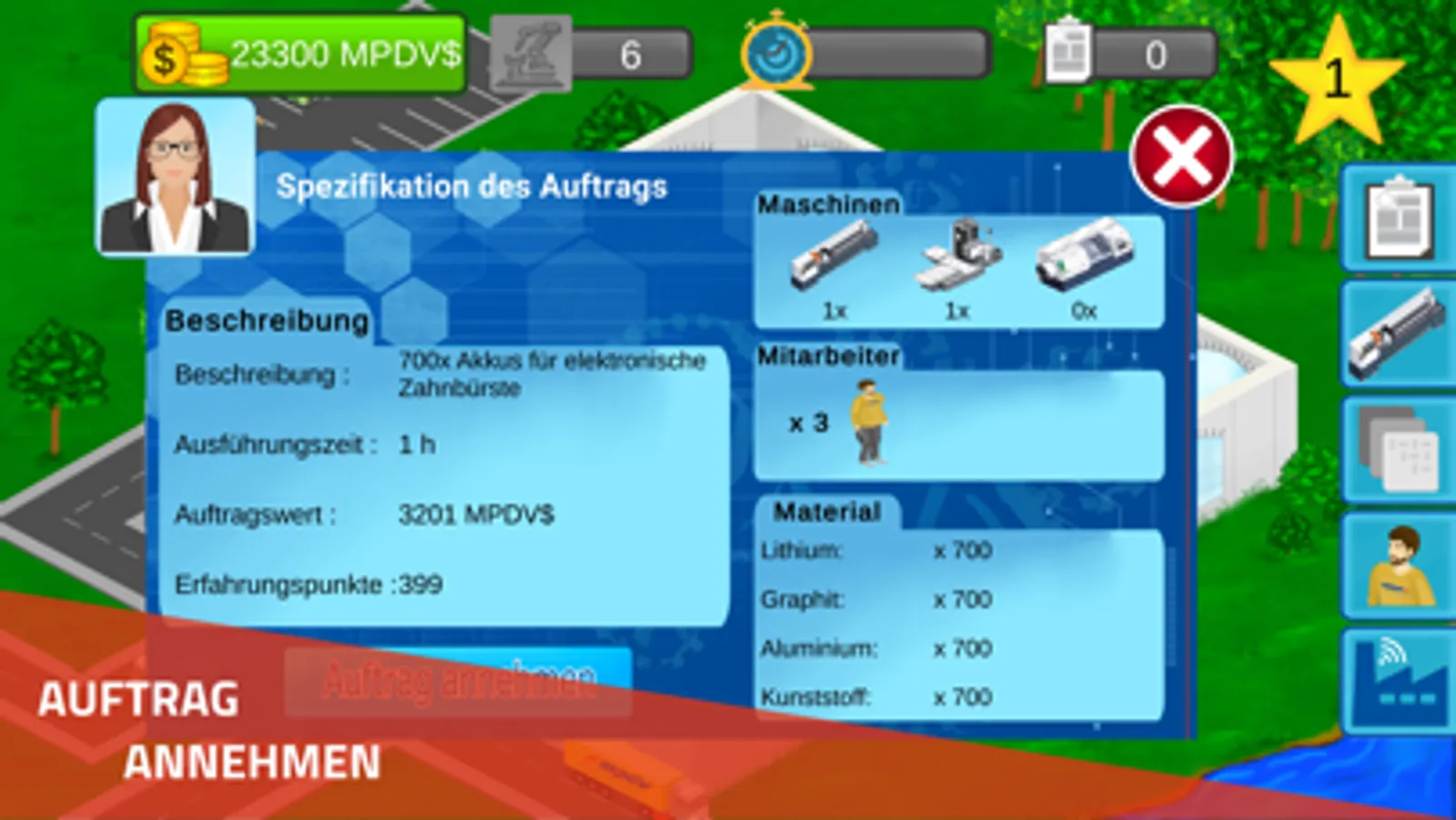 • Ziel ist es, möglichst viele Produktionsaufträge effizient zu erledigen, um den maximalen Gewinn einzufahren. Die Aufträge unterscheiden sich in der Ausführungszeit, der Komplexität und dem Einkommen, das erzielt wird, sobald der Auftrag erfolgreich abgeschlossen ist.