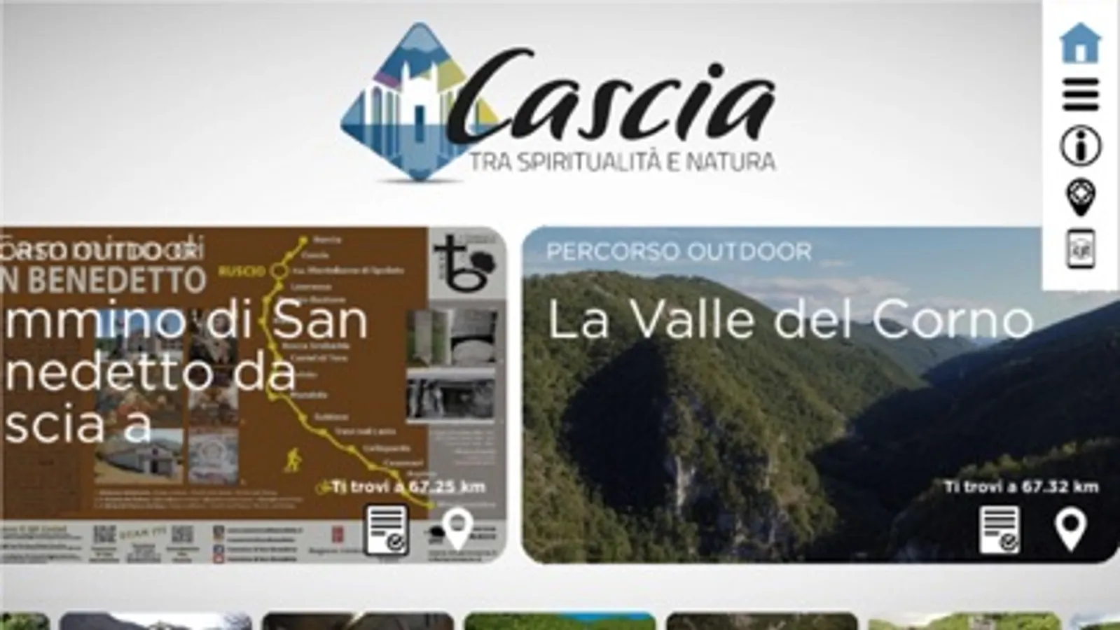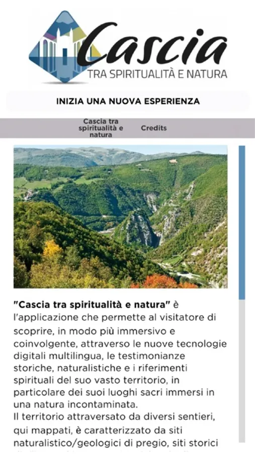 “Cascia tra spiritualità e natura” è l’applicazione che permette al visitatore di scoprire, in modo più immersivo e coinvolgente, attraverso le nuove tecnologie digitali multilingua, le testimonianze storiche, naturalistiche e i riferimenti spirituali del suo vasto territorio, in particolare dei suoi luoghi sacri immersi in una natura incontaminata.