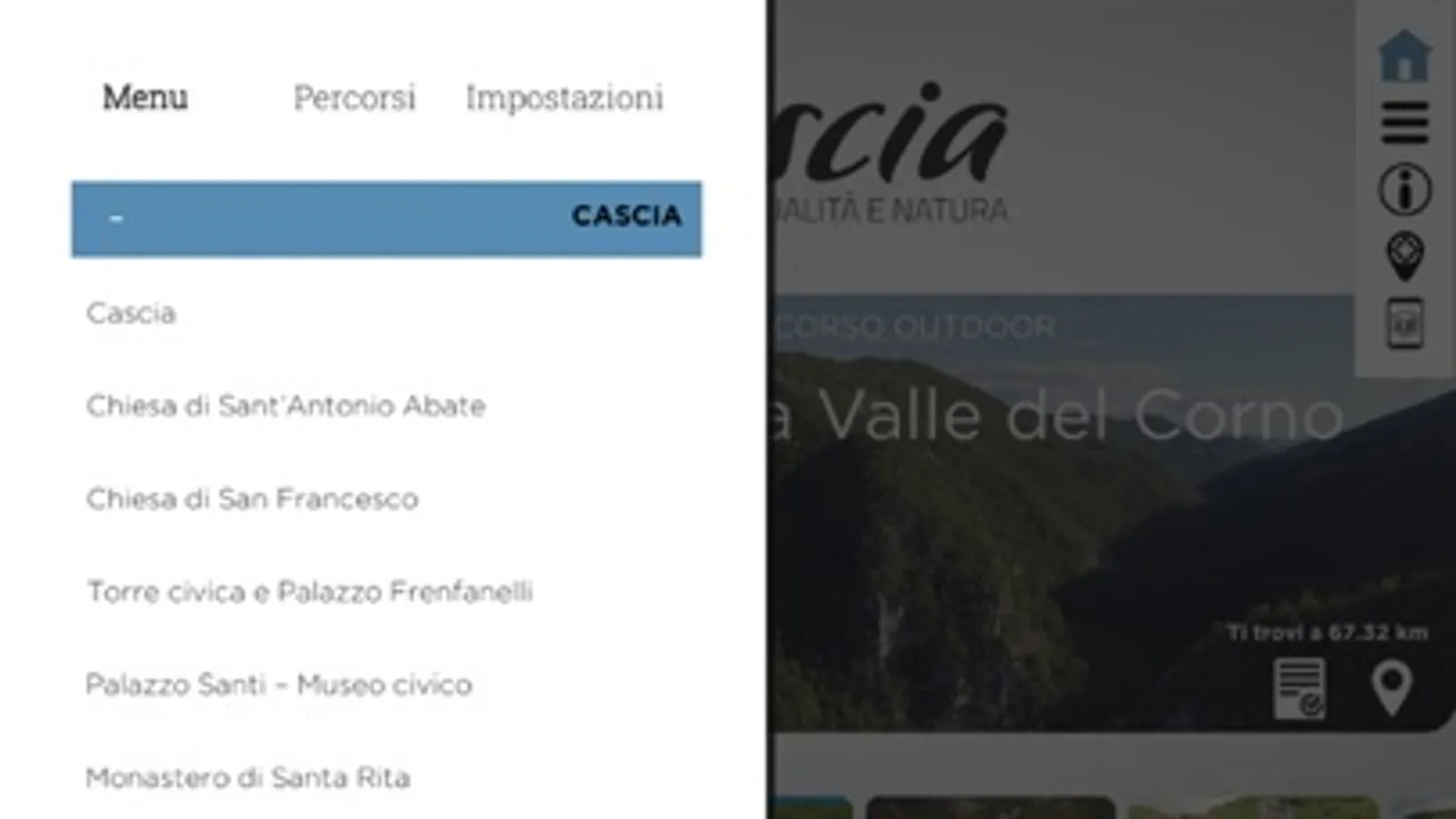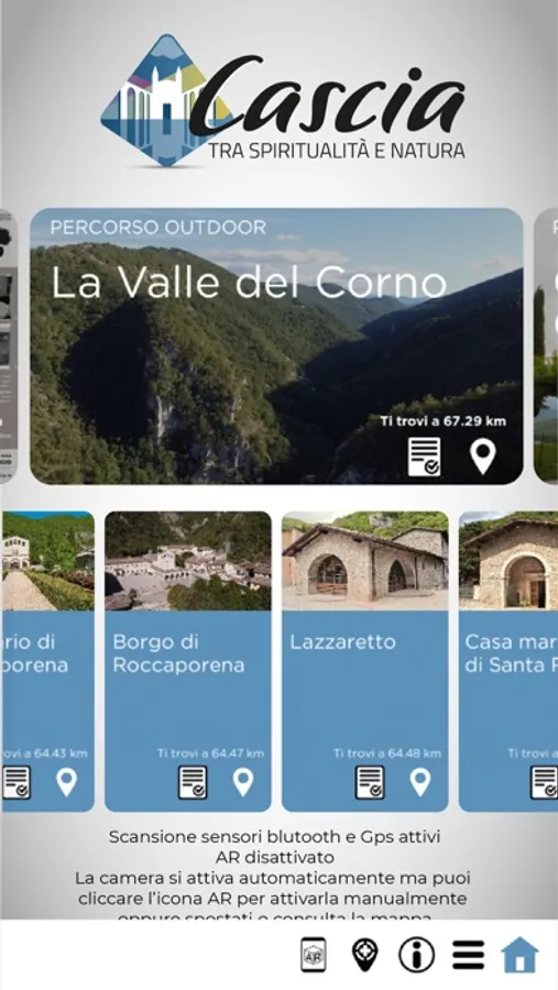 “Cascia tra spiritualità e natura” è una applicazione che sfrutta le funzioni del GPS, dell’Augmented Reality e del Bluetooth per dare al turista una esperienza unica e coinvolgente di visita del patrimonio culturale e naturalistico del territorio di Cascia.