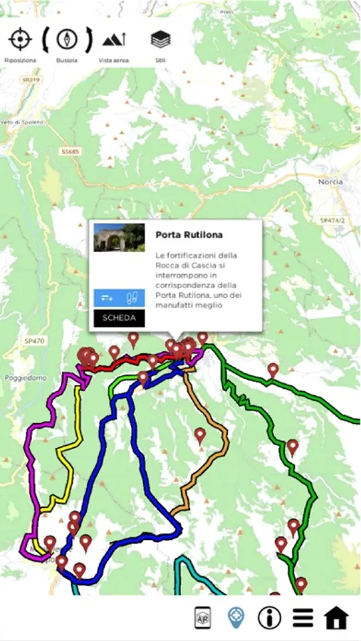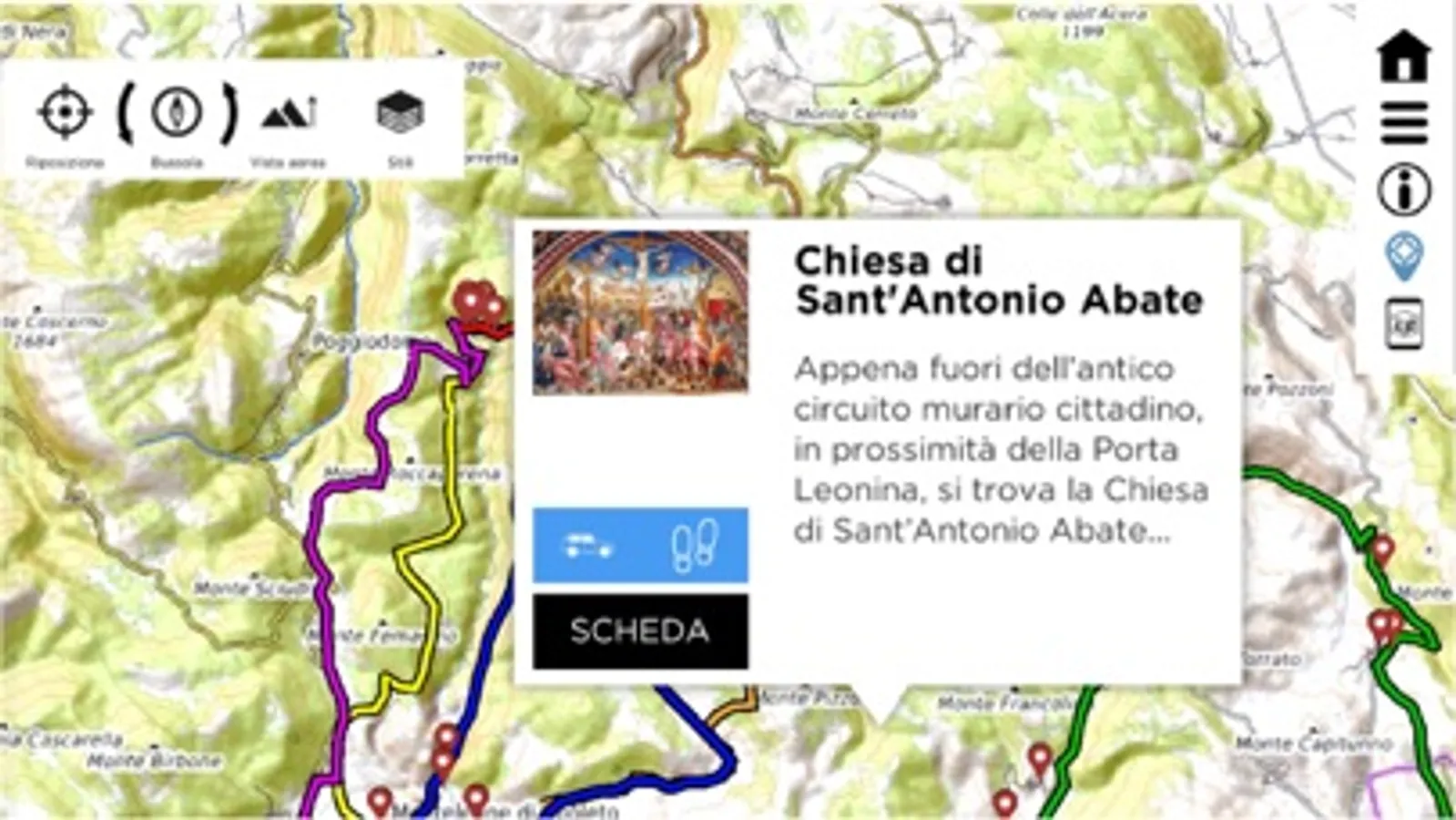 L’Applicazione è disponibile per dispositivi Ios e permette all’utente di fruire dei monumenti, dei siti di interesse e dei percorsi sentieristici, attraverso l’interazione con i sistemi integrati dello smartphone (geolocalizzazione, mappa degli itinerari, navigatore) La grande novità di questo sistema è la possibilità per il visitatore di scaricare una unica APP che gestisce visite guidate, percorsi cittadini ed esperienze outdoor contemporaneamente, basandosi su un sistema open data. L’APP consente inoltre di effettuare esperienze di visita sia online che offline, senza necessità di utilizzo della rete in continuo, gestire itinerari outdoor grazie alla integrazione dei diversi sensori del telefono, con possibilità di risoluzione spaziale molto elevata, gestire informazioni multitematiche ed eventi differenti.
