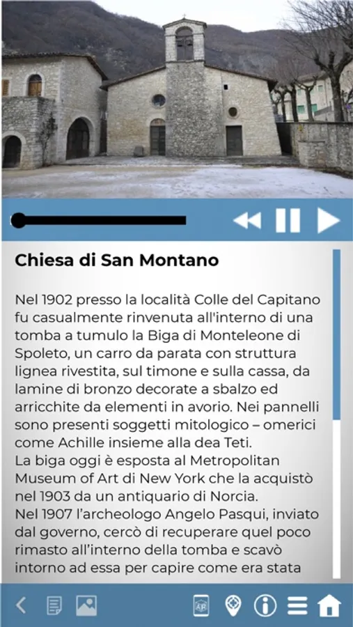 Se un punto di interesse o un bene culturale segnalato sarà nelle vicinanze allora l’APP automaticamente attiverà l’audioguida di quel punto e consentirà la consultazione della scheda monumento in modalità touchless. In basso è presente il pannello di controllo. Per consultare le schede degli attrattori culturali basta toccare il tasto MENU. Gli altri pulsanti attivano la REATÀ AUMENTATA (AR), permettono di accedere alla schermata MAPPA e consentono di riportare l’utente al pannello INFO.