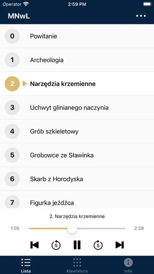 Aplikacja umożliwia zwiedzanie Muzeum Narodowego w Lublinie z audioprzewodnikiem. W czasie audiowycieczki zapoznamy się z bogatą kolekcją zbiorów muzealnych reprezentujących różne dziedziny kultury i sztuki. Audioprzewodnik przeprowadzi nas przez następujące wystawy: